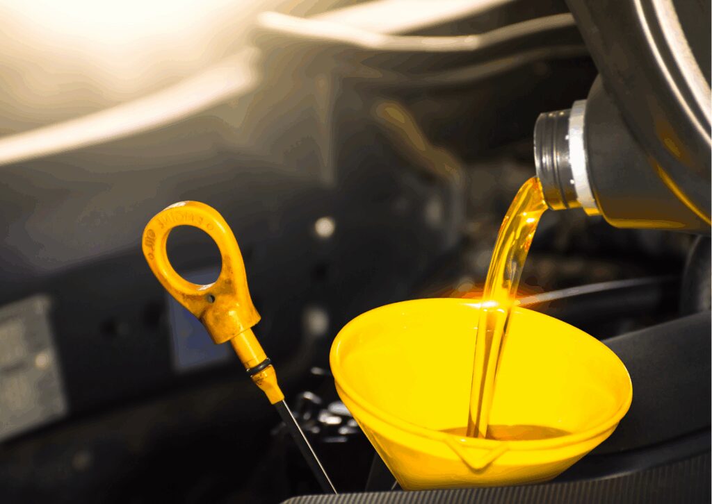 Motor oil being poured into engine during service, highlighting maintenance and how many kms between oil changes.