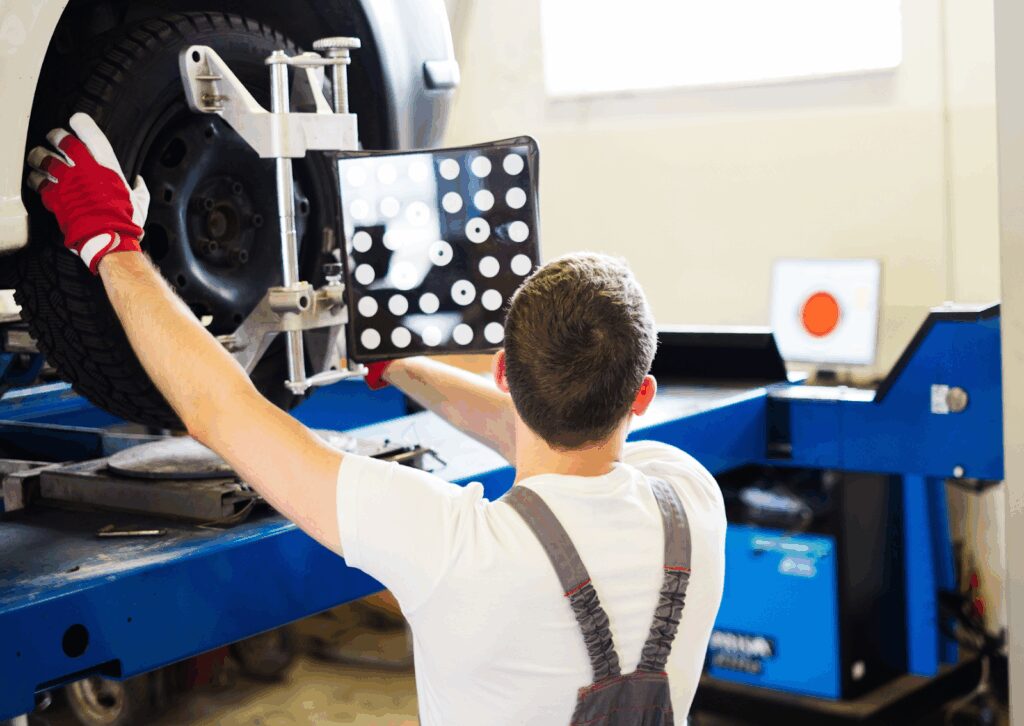 Mechanic adjusting car’s wheel on alignment machine, illustrating how long does a wheel alignment take in a shop.